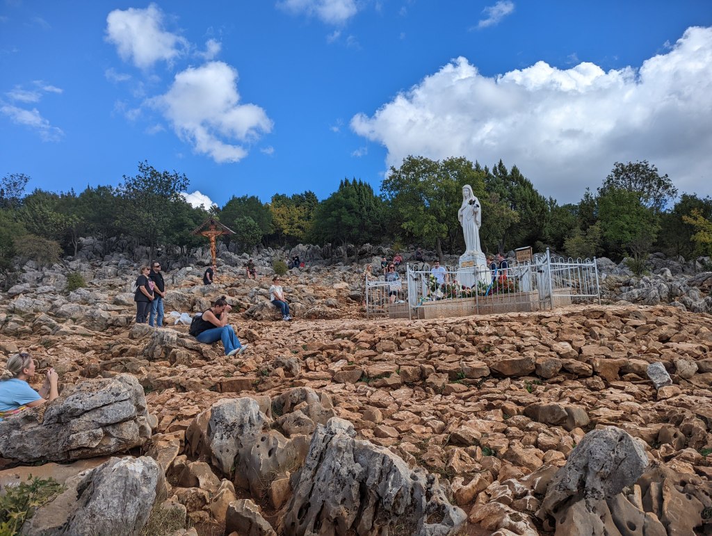 - Dependiendo del día, elegimos ir a la colina de las apariciones y hacer una caminata desde el centro hasta la colina. Conforme subes la colina te percatas de que está formada por rocas y cantos rodados que han visto 40 años de erosión por peregrinos que han ido pisandolas hasta suavizarlas. Aunque la caminata se puede hacer relativamente rápido dependiendo de tu nivel de condición física, presenciarás muchas cosas durante esa caminata. Tanta gente intentando llegar a ese punto donde Maria se apareció por primera vez hace más de 40 años. Al llegar al lugar donde se encuentra la estatua de María. Algunas personas hacen la caminata por su fe y otras tal vez por curiosidad, pero cuando llegas a ese lugar de paz es algo fuera de este mundo. A pesar de que hay cientos o miles de personas allí, el silencio es increíble. Realmente puedes tomarte el tiempo para estar quieto y rezar o simplemente contemplar la vista del pueblo y muchos creyentes poniendo sus corazones frente a nuestra señora. El lugar es una contradicción del tiempo porque el tiempo vuela cuando estás en la colina, pero al mismo tiempo parece no moverse porque haces mucho. Es difícil de explicar, pero lo sin percatarte del tiempo es que es hora de descender.